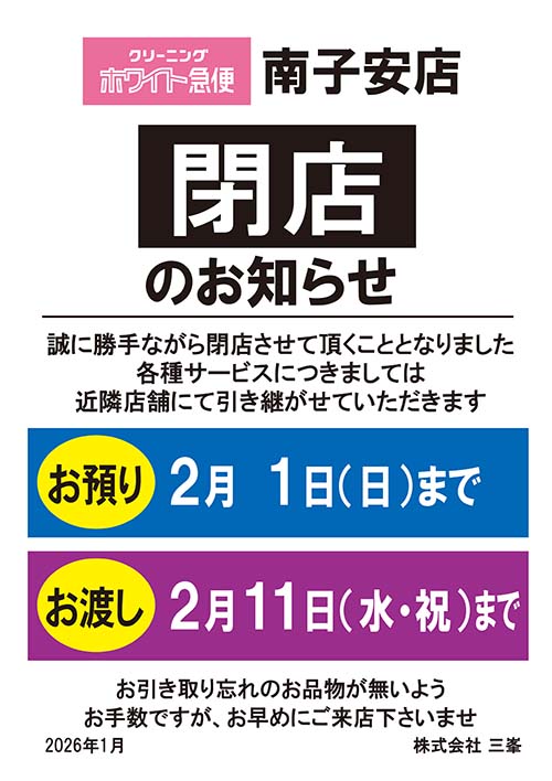 | ■ホワイト急便ミツミネ ドライブスルー南子安店 閉店のお知らせ |